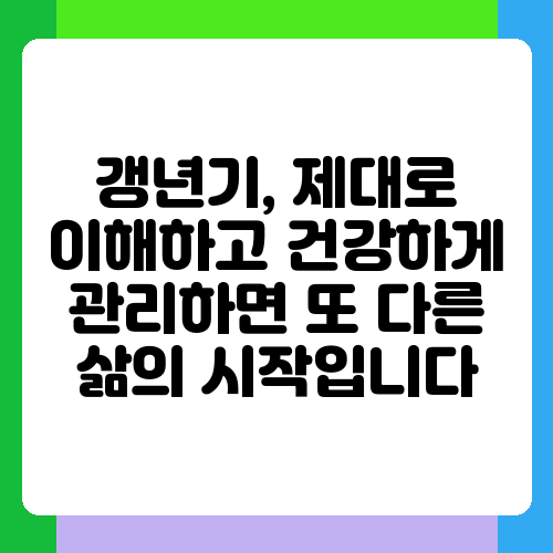 갱년기는 쉽지 않은 과정이지만, 두려워하지 않고 적극적으로 대처한다면 건강하고 행복한 삶을 누릴 수 있습니다. 자신의 몸에 귀 기울이고, 필요한 정보를 찾고, 전문가의 도움을 적극적으로 받으세요. 그리고, 주변 사람들과 소통하며 지지받는 것도 잊지 마세요. 갱년기 증상은 다양하고 개인차가 크므로, 자신에게 맞는 관리 방법을 찾아 꾸준히 실천하는 것이 가장 중요합니다. 이 글이 여러분의 갱년기 관리에 조금이나마 도움이 되었기를 바라며, 건강하고 행복한 갱년기를 보내시길 응원합니다. 궁금한 점이 있다면 언제든지 전문가와 상담하세요. 더 나은 삶을 위한 여정에 여러분과 함께 하겠습니다!