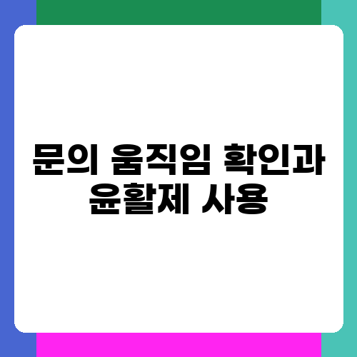 문이 뻑뻑하게 움직인다면, 문과 문틀 사이에 윤활제를 사용해보세요. 가정용으로 사용하는 실리콘 스프레이나 WD-40 같은 윤활제를 문의 경첩 부위와 문과 문틀이 맞닿는 부분에 살짝 뿌려주면 문이 부드럽게 움직이는 것을 경험하실 수 있을 거예요. 윤활제를 사용할 때는 과도하게 사용하지 않도록 주의하고, 문을 몇 번 열고 닫아 윤활제가 골고루 퍼지도록 해주세요. 만약 문의 움직임이 아예 안 된다면, 문짝이 틀어지거나 경첩이 고장났을 가능성도 있으니, 전문가에게 문의해 보는 것이 좋습니다. 문제가 심각하다면, 혼자 해결하려고 하기 보다는 전문가의 도움을 받는 것이 더 안전하고 효율적일 것입니다.