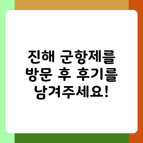 이제 봄날의 아름다운 추억을 만들 준비가 되셨나요? 진해 군항제는 잊지 못할 아름다운 경험을 선사할 거예요. 화려한 벚꽃과 다채로운 행사, 그리고 봄의 향기 가득한 진해에서 멋진 추억을 만들어보세요! 여행 후에는 여러분의 소중한 경험을 공유해주시면 감사하겠습니다. 다른 분들도 여러분의 후기를 통해 진해 군항제를 더욱 풍성하게 즐길 수 있을 거예요. 멋진 사진과 함께 여러분의 진해 군항제 이야기를 들려주세요!
