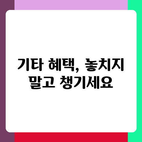 이 외에도 중장년층을 위한 다양한 정부 지원 제도가 있습니다. 예를 들어, 교육비 지원, 문화·여가 지원 등 다양한 혜택이 존재합니다. 정부 또는 지자체 웹사이트, 주민센터 등을 통해 자신에게 맞는 지원 제도를 찾아보고 적극적으로 활용하는 것이 좋습니다. 모든 정보를 한꺼번에 파악하기 어렵다면, 주민센터나 관련 기관에 문의하여 도움을 받는 것을 추천드립니다. 중장년층의 삶의 질 향상을 위해 마련된 다양한 지원 제도를 잘 활용하여 풍요로운 삶을 누리세요.