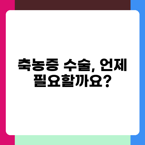 축농증 수술은 약물 치료에도 불구하고 증상이 호전되지 않거나, 만성적인 축농증으로 인해 일상생활에 심각한 지장을 초래하는 경우에 고려됩니다. 또한, 부비동 내에 폴립이 형성되어 있거나, 부비동의 구조적인 이상이 있는 경우에도 수술이 필요할 수 있습니다. 수술은 내시경을 이용한 최소침습적인 방법으로 진행되며, 회복 기간도 비교적 짧다고 합니다. 하지만 수술에는 위험이 따르기 때문에, 수술 여부는 의사와 충분한 상담을 통해 신중하게 결정해야 합니다. 저는 수술 후 회복이 빨랐고, 지금은 증상이 거의 없답니다. 수술이 꼭 필요한 경우라면 너무 걱정하지 말고 전문의와 상담하세요.